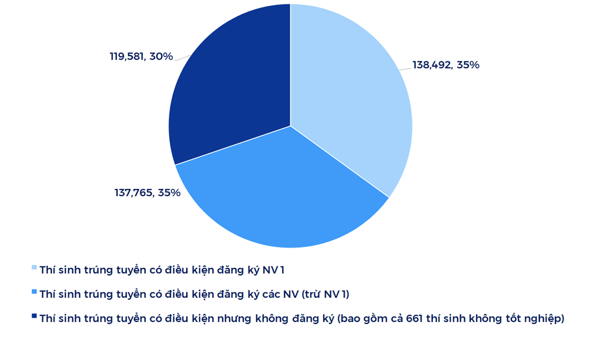 Hệ thống của Bộ GD&ĐT ghi nhận số thí sinh đủ điều kiện trúng tuyển sớm do các trường ĐH công bố là gần 400.000, số thí sinh xét tuyển ĐH năm nay là 620.000 thí sinh. Tuy nhiên tỉ lệ thí sinh đặt nguyện vọng trúng tuyển sớm ở NV1 chỉ là 35%, từ NV2 trở đi là 30%, còn lại 35% không sử dụng quyền lợi trúng tuyển sớm hoặc không đủ điều kiện tốt nghiệp.