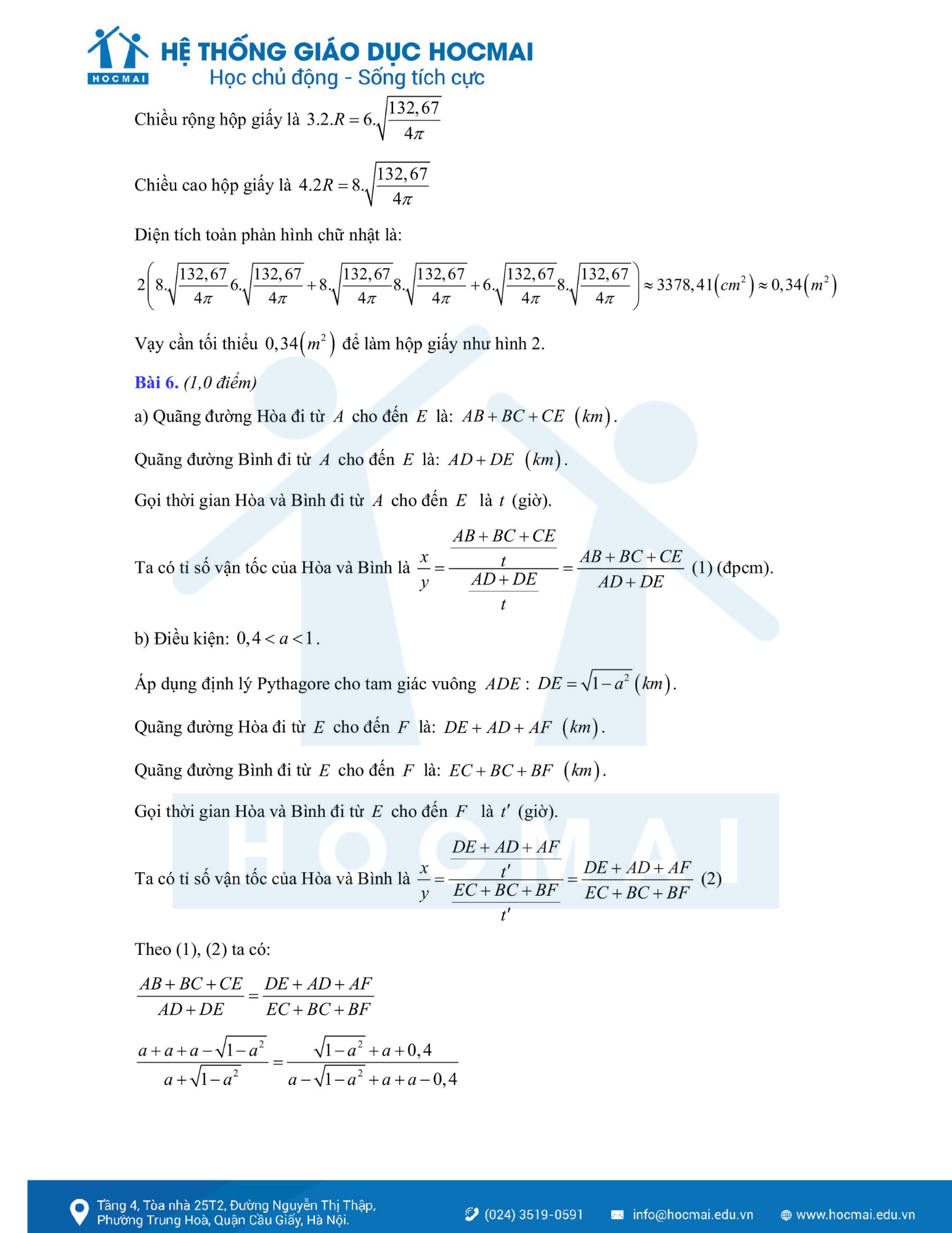 Bài 6: Đây là bài toán nhằm đánh giá khả năng đọc hiểu và tư duy logic của thí sinh. Để giải quyết tốt, học sinh cần nắm vững kiến thức về hình học, đại số và các mối liên hệ thực tiễn (giữa quãng đường, thời gian và vận tốc),… đồng thời thí sinh phải có tư duy rõ ràng, mạch lạc và khả năng phân tích, lập luận tốt (phân tích mối liên hệ giữa các thông số trong từng trường hợp: gặp nhau lần đầu và lần thứ hai).