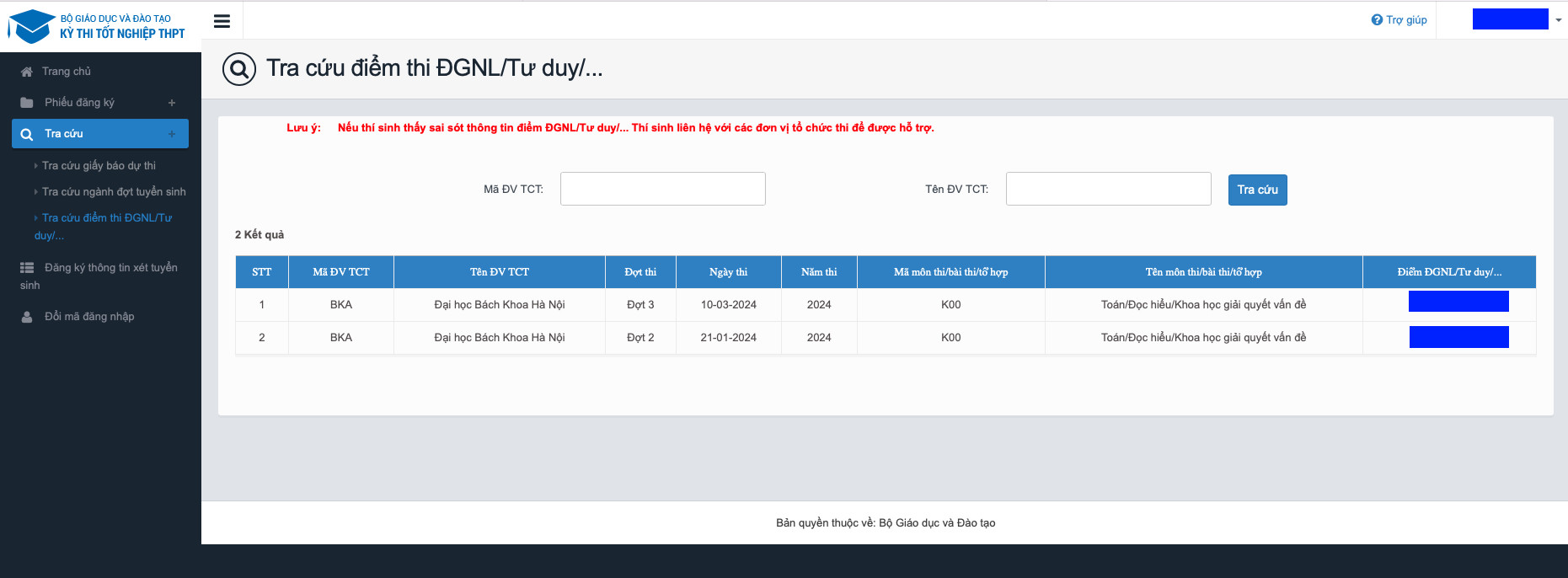 Các thí sinh tham dự kỳ thi kỳ thi đánh giá tư duy để sử dụng kết quả xét tuyển đại học năm 2024 lưu ý: Điểm thi của các em sẽ được Đại học Bách khoa Hà Nội đưa lên tài khoản của thi sinh trên hệ thống của Bộ Giáo dục và Đào tạo, tại địa chỉ https://thisinh.thitotnghiepthpt.edu.vn/