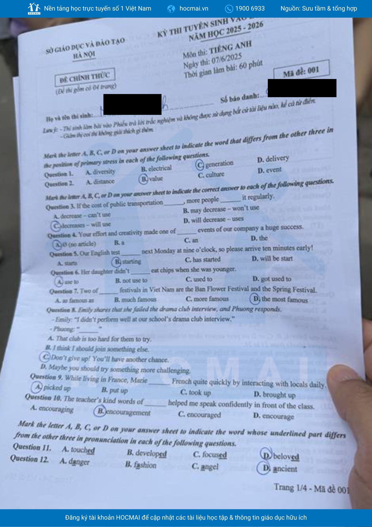 Hơn 116.000 thí sinh tại Hà Nội bước vào môn thi Tiếng Anh – môn thi thứ hai trong kỳ tuyển sinh vào lớp 10 THPT công lập năm học 2025–2026. Với thời gian làm bài 60 phút, đề thi gồm 40 câu, chia thành nhiều dạng bài quen thuộc: phát âm, trọng âm, ngữ pháp – từ vựng, chức năng giao tiếp, sửa lỗi sai, nối câu, viết lại câu, đọc hiểu, và điền từ vào đoạn văn. Đáng chú ý, đề có hai bài đọc hiểu ở phần cuối – trong đó một bài nói về vai trò của ngôn ngữ trong đời sống toàn cầu, bài còn lại bàn về thói quen mua sắm trực tuyến – đều là những chủ đề gần gũi, thời sự, phù hợp với lứa tuổi học sinh.
