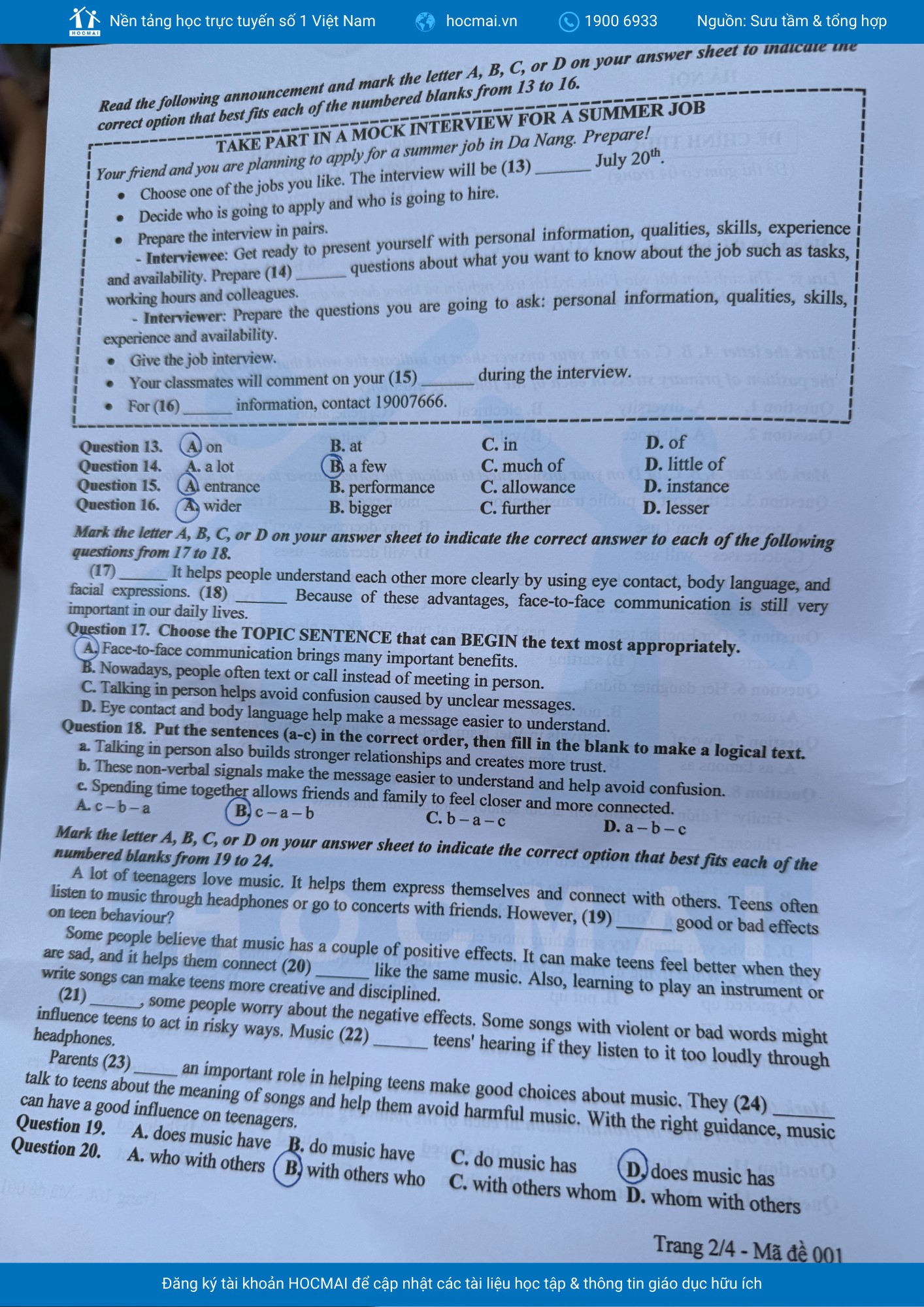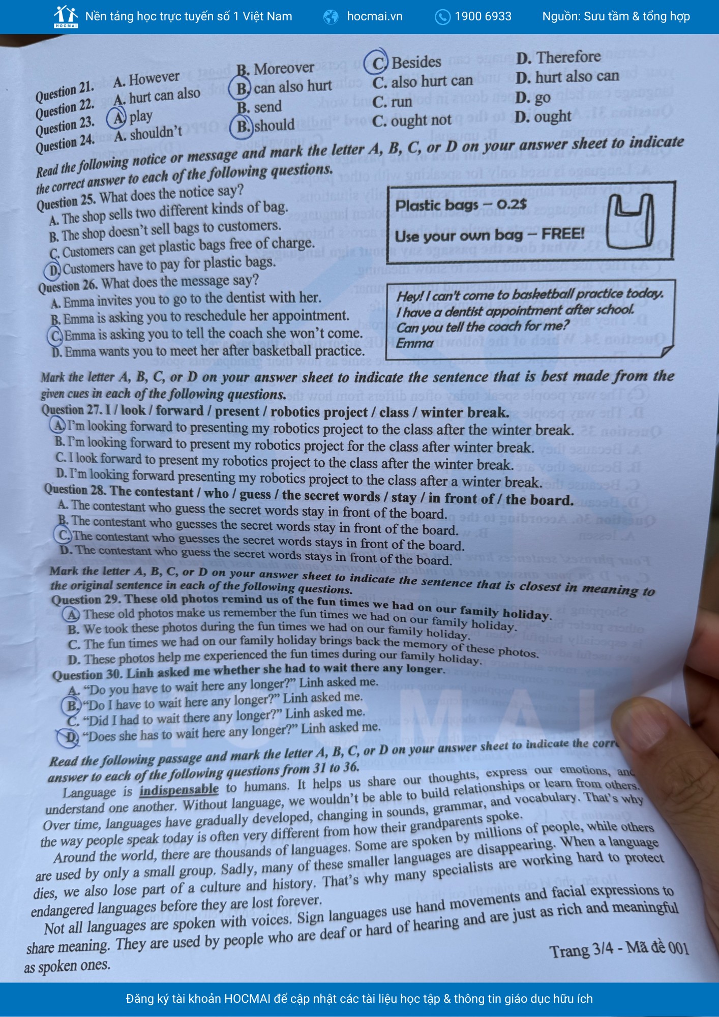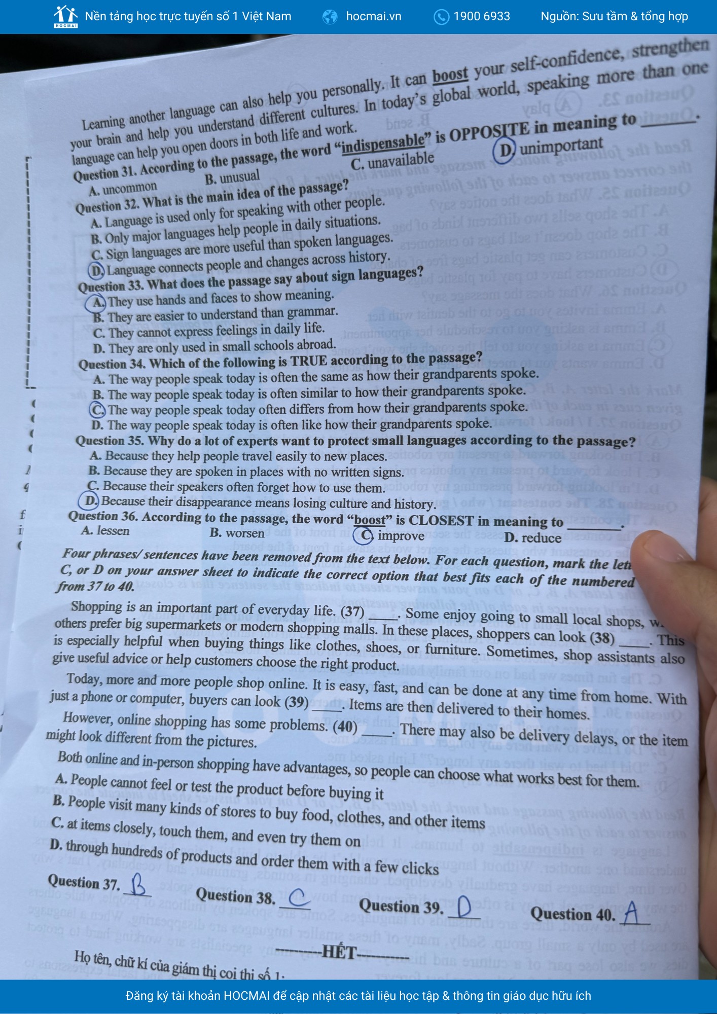 Các câu hỏi từ vựng – ngữ pháp ở phần đầu được sắp xếp tăng dần về độ khó, giúp thí sinh dễ dàng nhập cuộc. Một số câu kiểm tra kiến thức mở rộng như cụm động từ (phrasal verbs), liên từ (conjunctions), hay phân biệt từ loại cũng góp phần phân hóa trình độ. Phần đọc hiểu và điền từ yêu cầu thí sinh có vốn từ vựng đủ rộng, khả năng suy luận logic và nắm bắt nhanh thông tin từ văn bản.