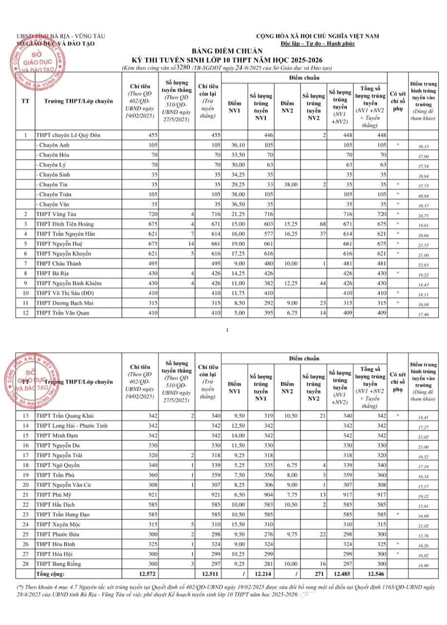 Ảnh chụp màn hình điểm chuẩn chính thức kỳ thi tuyển sinh lớp 10 năm học 2025 – 2026 của tỉnh Bà Rịa – Vũng Tàu