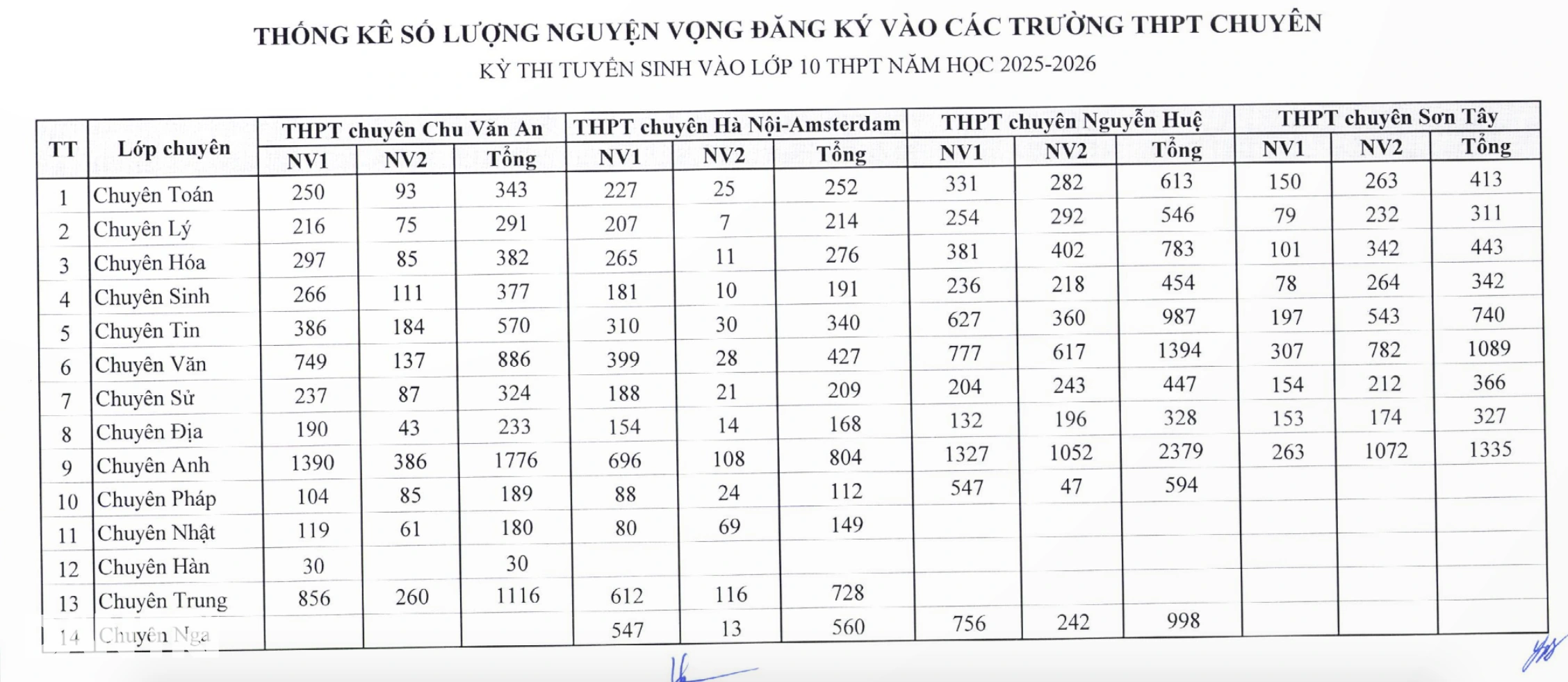 Năm nay, hơn 16.000 thí sinh đăng ký thi vào lớp 10 chuyên tại 4 trường THPT chuyên của Hà Nội, với tổng chỉ tiêu là 2.730. Tỷ lệ chọi trung bình là gần 1/6. Đặc biệt, lớp chuyên tiếng Trung của Trường THPT chuyên Chu Văn An có tỷ lệ chọi cao nhất, lên đến 1/24,46, với 856 hồ sơ đăng ký cho 35 chỉ tiêu .
