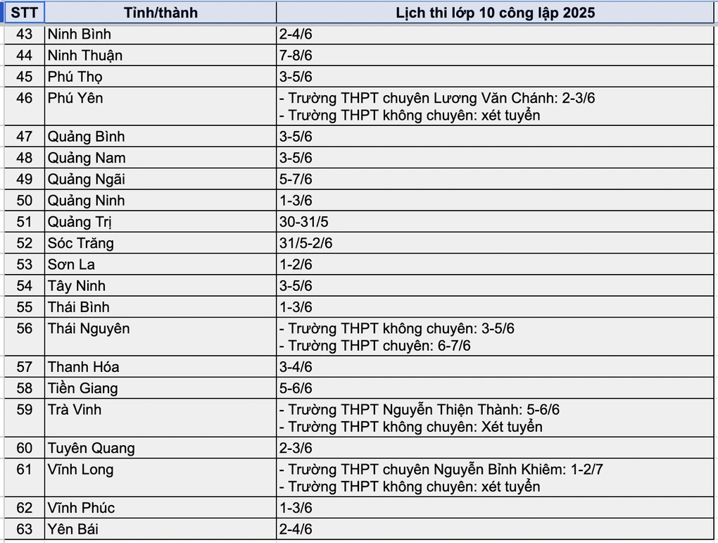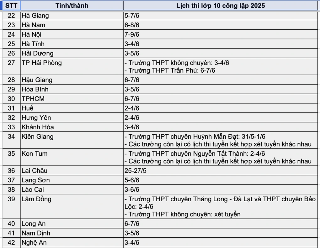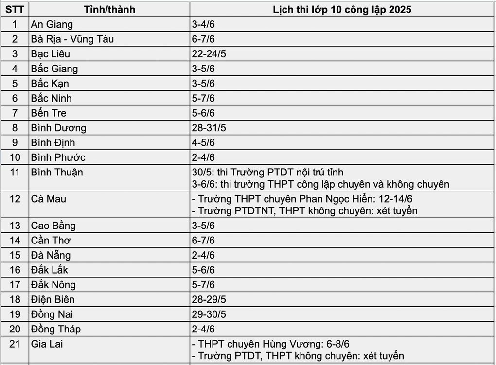 Kỳ thi tuyển sinh lớp 10 công lập năm 2025 bắt đầu từ tuần này, khởi động với tỉnh Bạc Liêu vào ngày 22–24/5. Tiếp theo là Lai Châu (25–27/5), và nhiều tỉnh khác cũng hoàn tất thi trong tháng 5 như Bình Dương, Điện Biên, Đồng Nai, Quảng Trị. Hà Nội tổ chức thi vào đầu tháng 6, kết thúc muộn nhất vào ngày 9/6 với kỳ thi chuyên. Đặc biệt, tỉnh Vĩnh Long là địa phương duy nhất thi vào tháng 7, chỉ áp dụng với Trường THPT chuyên, còn lại các trường khác xét tuyển.