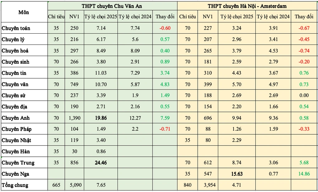 | Môn Chuyên | Trường | Chỉ Tiêu | Số Lượng Đăng Ký | Tỷ Lệ Chọi |