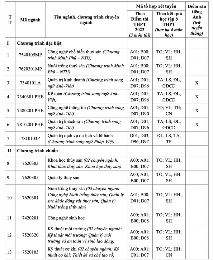 Mã tổ hợp xét tuyển và điều kiện tiếng Anh cho từng chuyên ngành/ngành học tại ĐH Nha Trang: