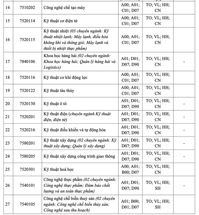 – KTCN: nhóm ngành công nghệ, kỹ thuật; sản xuất, chế biến; thủy sản