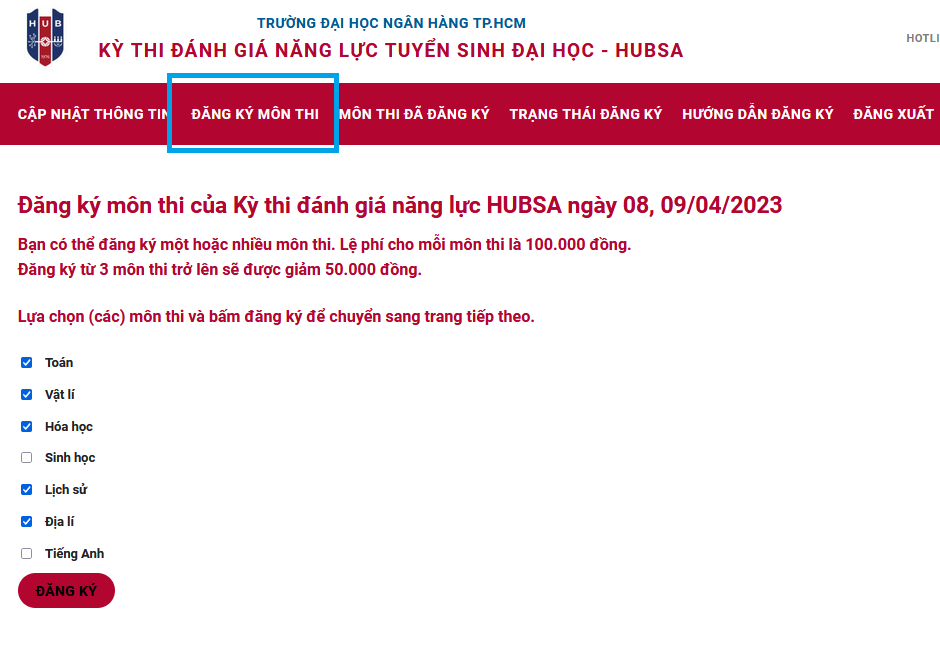 Hệ thống sẽ hiển thị các môn thi được đăng ký cho kỳ thi (cụ thể trên hình là kỳ thi ngày 8-9/4/2023). Trường hợp đã đăng ký, khi truy cập, hệ thống sẽ tick sẵn những môn thí sinh đã đăng ký trước đó.
