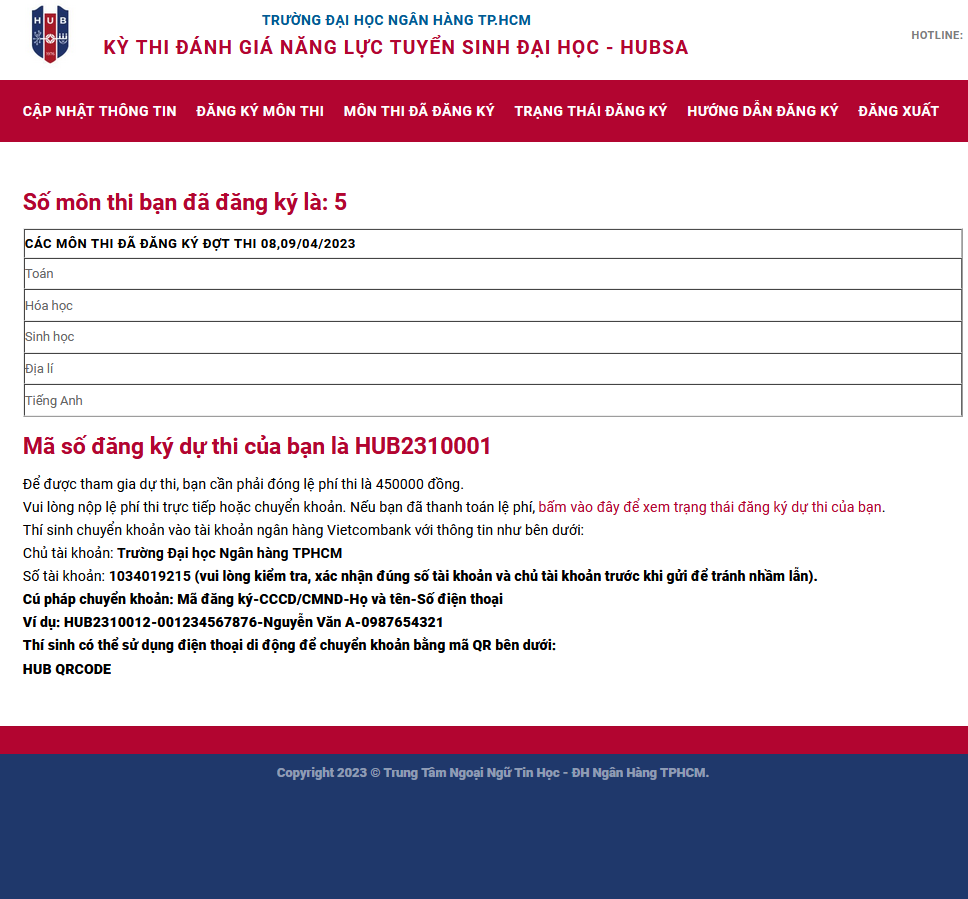 Ngoài ra, mã số dự thi của thí sinh cũng được hiển thị. Thí sinh sẽ dùng mã số này để chuyển tiền cũng như phục vụ các dịch vụ khác sau này.