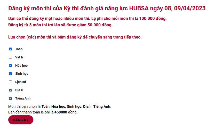 Hệ thống sẽ tự động tính lệ phí cần đóng cho thí sinh khi lựa chọn hoặc thay đổi môn thi.