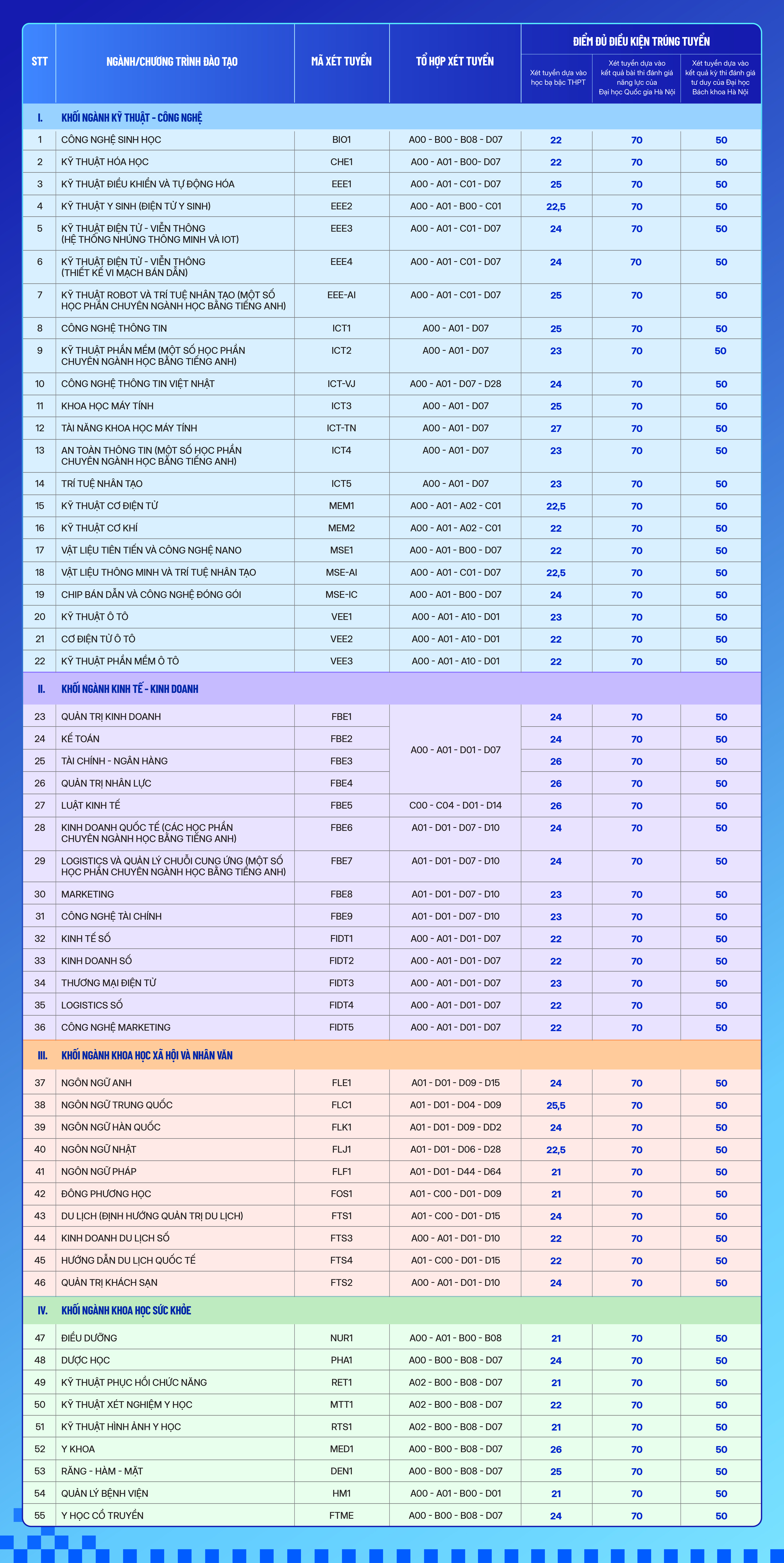 - Điểm đủ điều kiện trúng tuyển là tổng điểm xét tuyển theo kỳ thi ĐGNL của Đại học Quốc gia Hà Nội hoặc theo kỳ thi đánh giá tư duy của Đại học Bách khoa Hà Nội;
