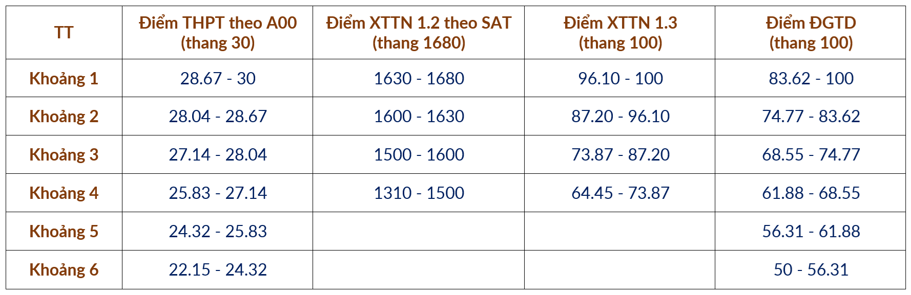 Tương tự, tính điểm chuẩn tương đương đối với điểm XTTN diện 1.3 cho chương trình MS2 sẽ thuộc khoảng phân vị tương ứng (Khoảng 3) có giá trị điểm XTTN từ [73.87 – 87.20). Khi đó các hệ số quy đổi tương ứng sẽ là: