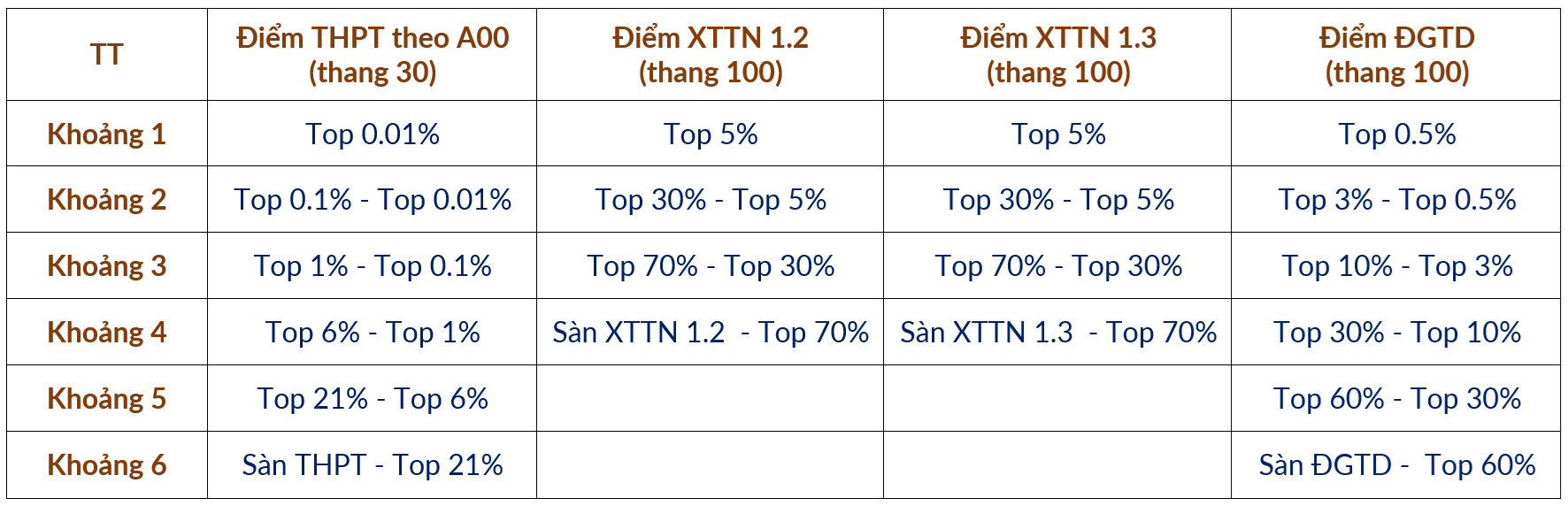 Ví dụ trong năm 2024, điểm chuẩn (điểm trúng tuyển) của ngành/chương trình MS2 – Kỹ thuật vi điện tử và Công nghệ nano của Đại học Bách khoa Hà Nội theo phương thức ĐGTD là 71.68 điểm (x = 71.68). Như vậy mức điểm chuẩn này sẽ thuộc khoảng phân vị 3 (Khoảng 3), có giá trị điểm ĐGTD từ [68.55 – 74.77). Khi đó điểm chuẩn tương đương đối với điểm thi tốt nghiệp THPT sẽ thuộc khoảng phân vị tương ứng (Khoảng 3) có giá trị điểm thi tốt nghiệp THPT từ [27.14 – 28.04). Từ đó xác định các hệ số quy đổi tương ứng sẽ là: