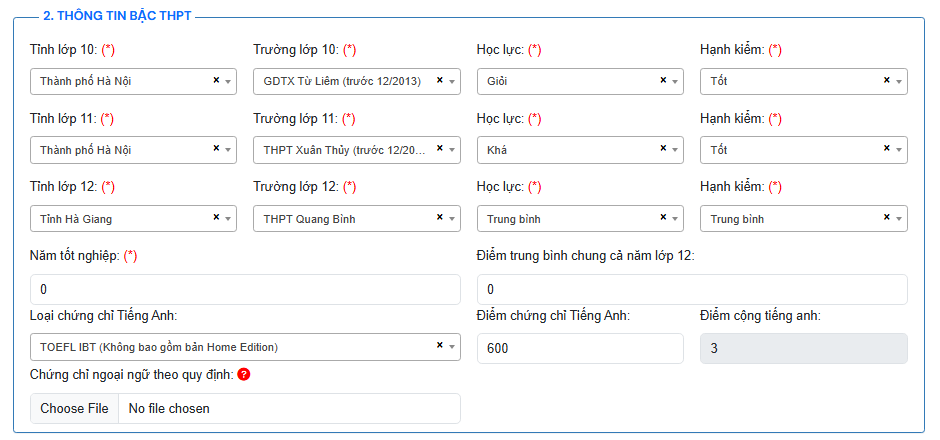 – Hồ sơ xét tuyển với phương thức xét tuyển dựa vào kết quả học tập cấp THPT (học bạ):