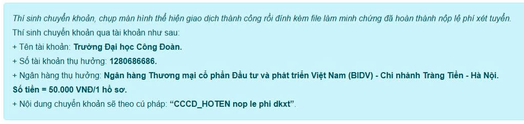 Chi phí đào tạo: Do đơn vị đặt hàng và người học chi trả, trên cơ sở thoả thuận giữa Trường Đại học Công đoàn và các đơn vị. Thông tin chi tiết Nhà trường sẽ có thông báo cụ thể trên website http://dhcd.edu.vn.