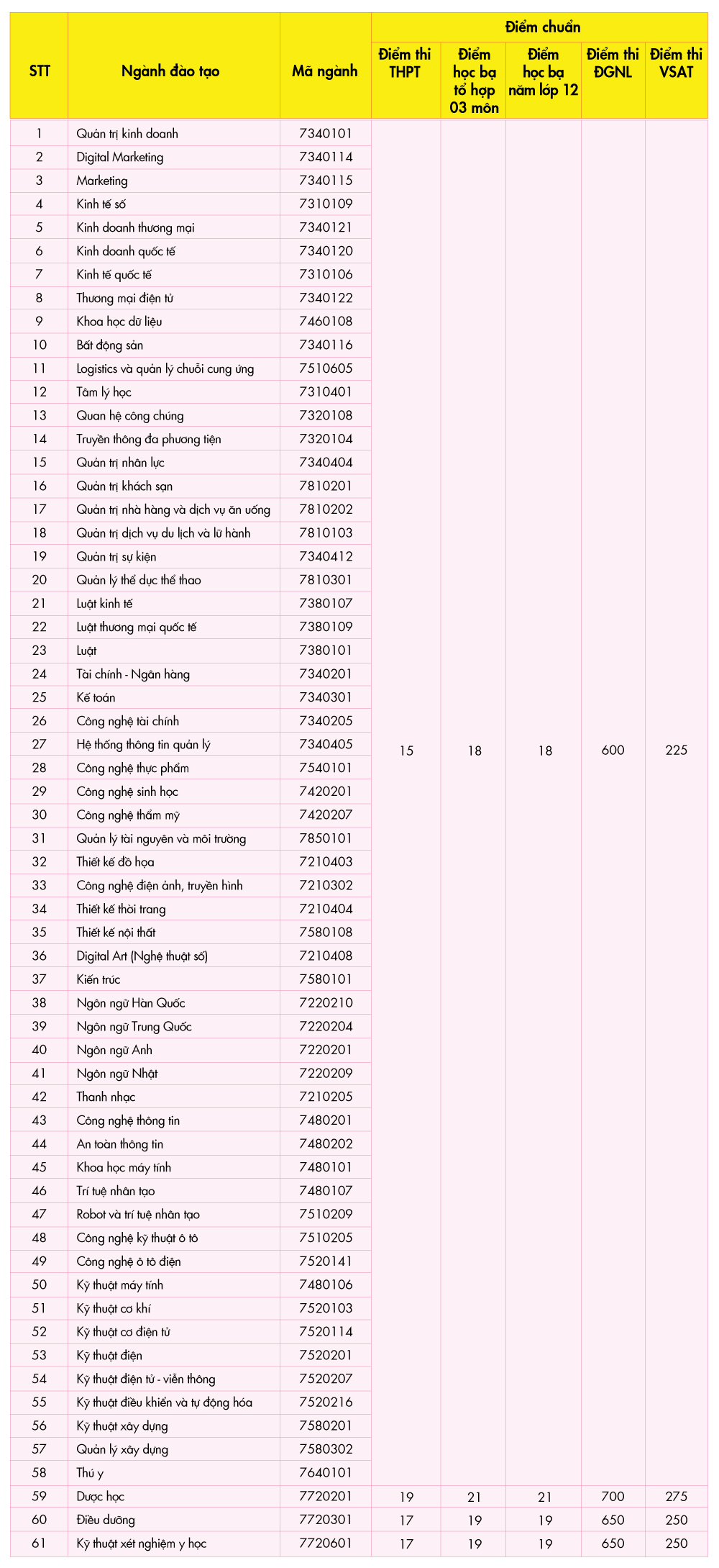Trường Đại học Công nghệ TP.HCM (HUTECH) vừa chính thức công bố điểm trúng tuyển đại học hệ chính quy năm 2025 qua bốn phương thức xét tuyển chính—với mức điểm dao động từ 15 đến 21 điểm. Và ngành Dược học một lần nữa ghi tên ở ngôi “quán quân” khi đạt 19 điểm, trong khi các ngành như Điều dưỡng và Kỹ thuật xét nghiệm y học giữ mức khá cao ở 17 điểm. Các ngành còn lại chỉ cần từ 15 điểm, tương đương mức cơ bản theo phương thức thi tốt nghiệp THPT. Còn nếu xét theo học bạ, ngành Dược học cần 21 điểm, Điều dưỡng & Kỹ thuật xét nghiệm y học ở mức 19 điểm, các ngành còn lại là 18 điểm. Với phương thức điểm thi đánh giá năng lực ĐHQG TP.HCM, ngưỡng điểm chuẩn là 700 điểm với Dược học, 650 điểm với Điều dưỡng và Kỹ thuật xét nghiệm, trong khi các ngành khác ở mức 600 điểm. Tương tự, theo kỳ thi VSAT, Dược học “vút” tới 275 điểm, trong khi Điều dưỡng và Kỹ thuật xét nghiệm dừng ở 250, còn các ngành còn lại yêu cầu 225 điểm.