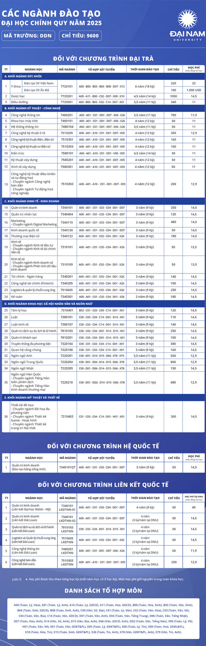 Chỉ tiêu tuyển sinh, tổ hợp môn xét tuyển và học phí của Trường Đại học Đại Nam năm 2025 (được tính theo kỳ học, mỗi năm có 03 học kỳ). Thông tin chi tiết được trình bày trong bảng dưới đây: