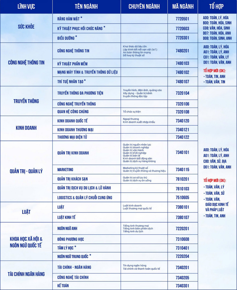 Năm nay, Nhà trường dự kiến mở thêm nhóm ngành sức khỏe như: Răng Hàm Mặt, Điều dưỡng, Kỹ thuật phục hồi chức năng, Trí tuệ nhân tạo (AI), Ngôn ngữ Trung Quốc , Tâm lý học