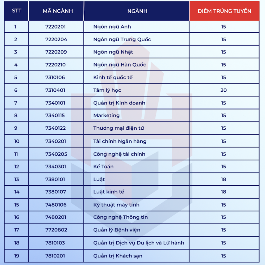 | Mức điểm chuẩn ban đầu (thi tốt nghiệp THPT) | Tâm lý học: 20; Luật: 18; Các ngành khác: 15 |