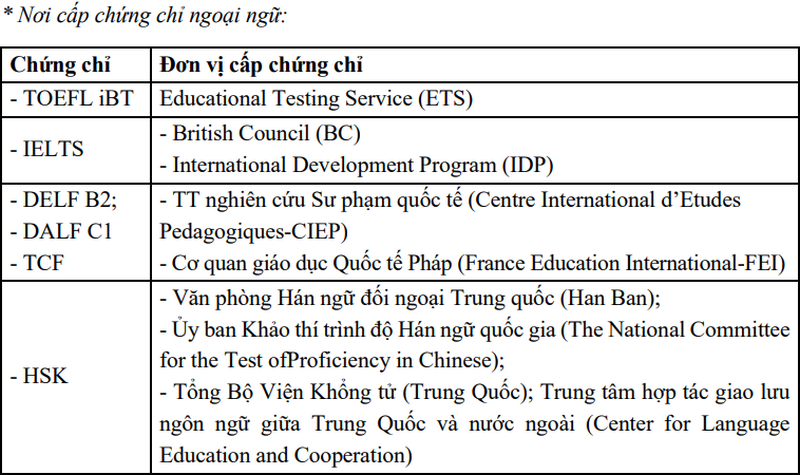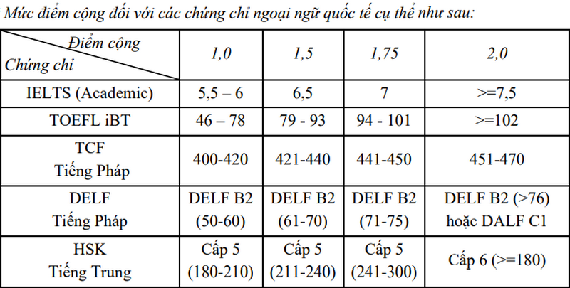 (2) – Điểm cộng đối với thí sinh có chứng chỉ ngoại ngữ quốc tế