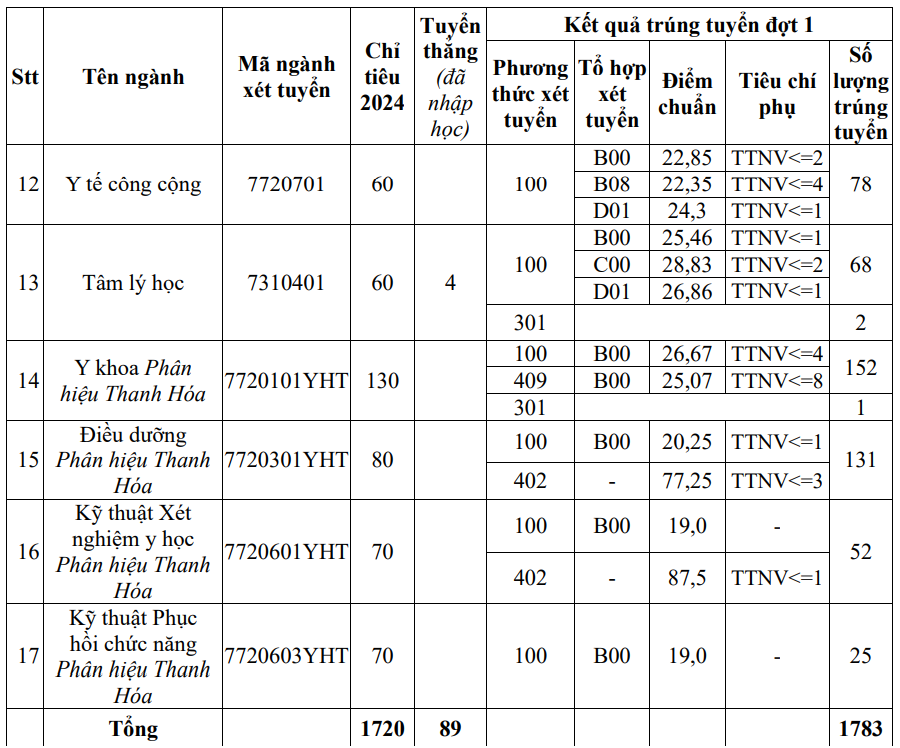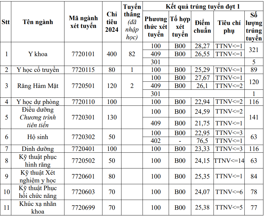 | ĐH Y Dược Huế / Cần Thơ / Thái Bình / Phạm Ngọc Thạch / Y Dược Hà Nội (ĐHQGHN) | 26–27 điểm | ~8,7–9 điểm/môn |