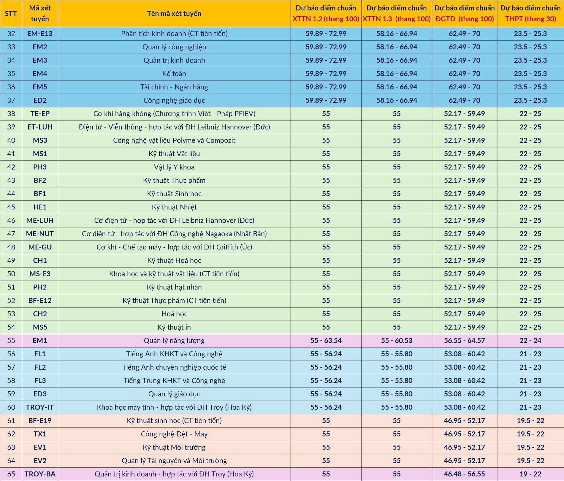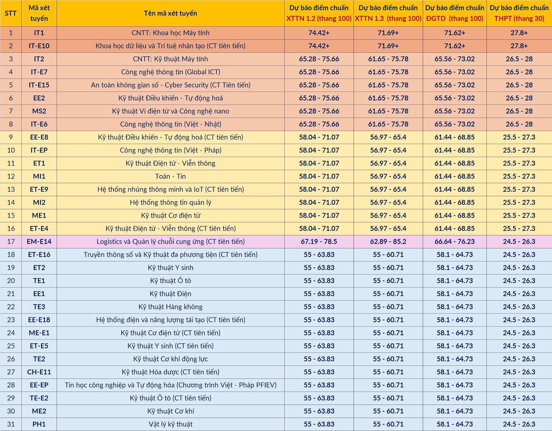 Dưới đây là dự báo điểm chuẩn các ngành của ĐH Bách khoa Hà Nội: