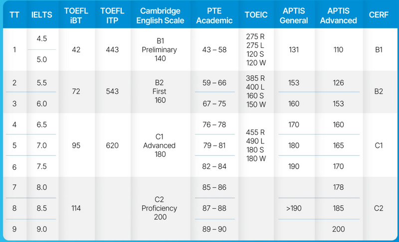 Bảng quy đổi tương đương trình độ tiếng Anh quốc tế dùng để ĐKXT vào trường Đại học CMC năm 2025