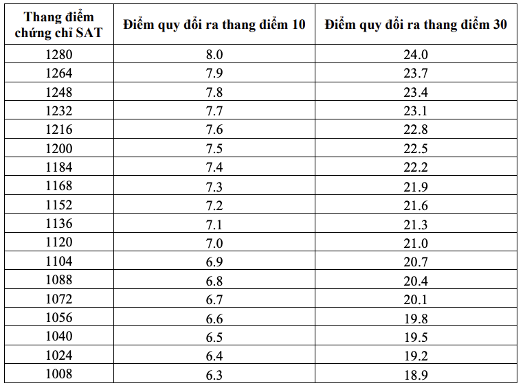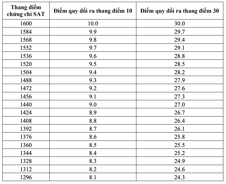 Với phương thức xét tuyển bằng chứng chỉ SAT, quy tắc quy đổi tương đương kết quả SAT ra thang điểm 30 của Trường Đại học Khoa học tự nhiên như sau: